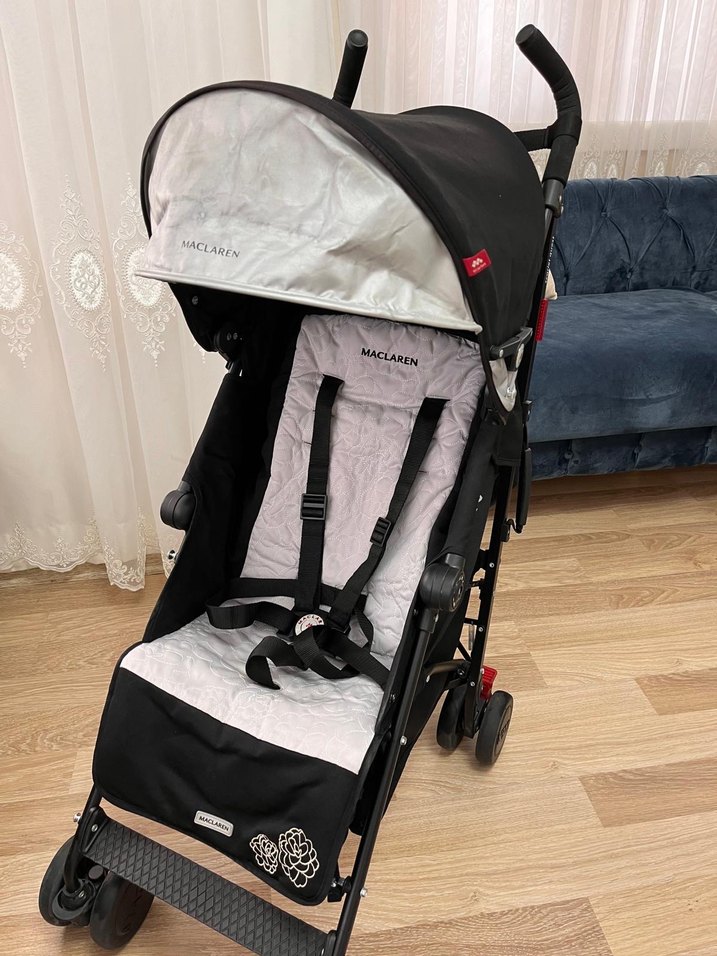 Maclaren bebek arabası, gri ve beyaz renklerde, yastıklı oturma alanı ve ayarlanabilir güvenlik kemeri ile. Güneşlik ve kolay hareket eden tekerlekler içerir.