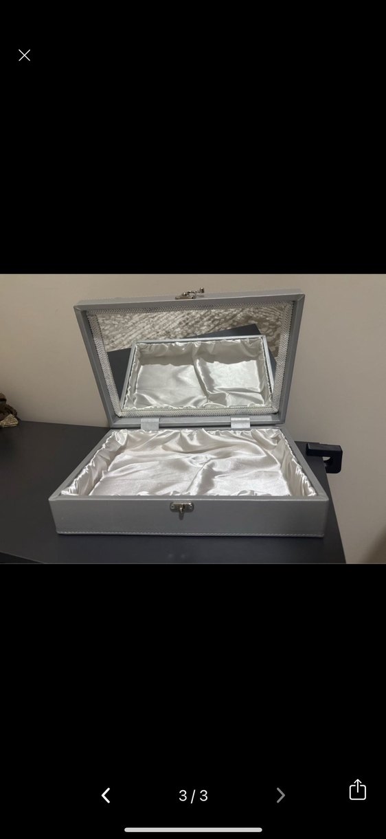 Gri beyaz renkte, içinde büyük ayna ve ipeksi kumaş kaplı iç bölmesi olan makyaj kutusu organizer.