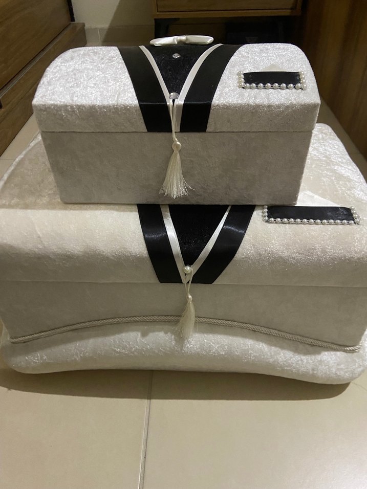 Beyaz ve gri tonlarda, siyah kurdele ve inci detaylı makyaj organizer kutusu. Fermuarında püskül bulunur, şık tasarıma sahiptir.