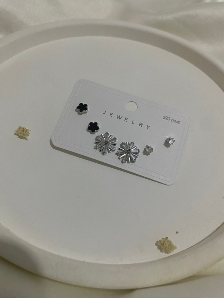 Gri ve beyaz renklerde, payetli ve baskılı detaylara sahip kısa uzunlukta, minimal bohem tarzda günlük kullanıma uygun küpe seti.