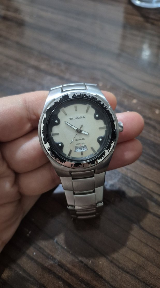 Gri ve beyaz renklerde minimalist tasarımlı JAGA marka erkek kol saati. Metal bilezikli, tarih göstergeli quartz mekanizma içerir. Rock punk tarzını yansıtır. ⌚Durumu bilinmiyor.
