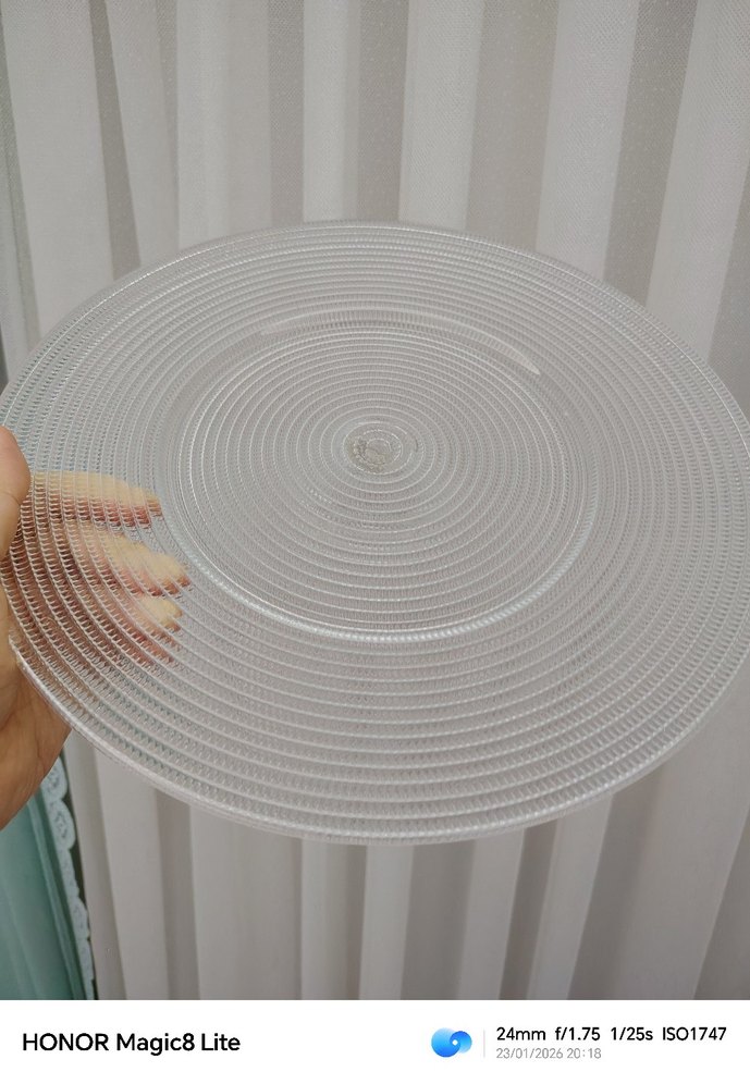 Gri ve beyaz renklerde, desen içermeyen, dokulu dairesel tasarıma sahip modern bir tabak. Şık ve çağdaş bir sunum sağlar. ️