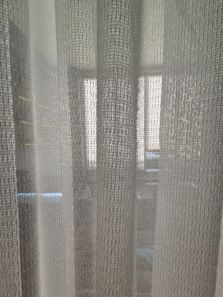 Bu modern perde, beyaz ve gri tonlarda ince örgü desene sahip olup, yumuşak ışığın geçmesine izin verirken mahremiyet sağlar. Her odaya modern ve zarif bir dokunuş katar.