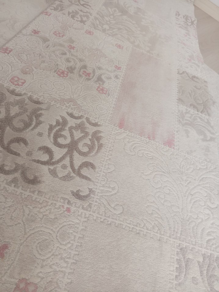 Gri ve beyaz tonlarda nakışlı desenli, modern ve klasik tarzı bir araya getiren yumuşak dokulu halı.