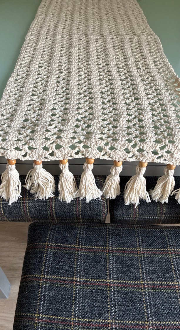 Krem nakışlı desen ve ahşap boncuklu püsküllerle süslenmiş yumuşak ve dekoratif ruuner