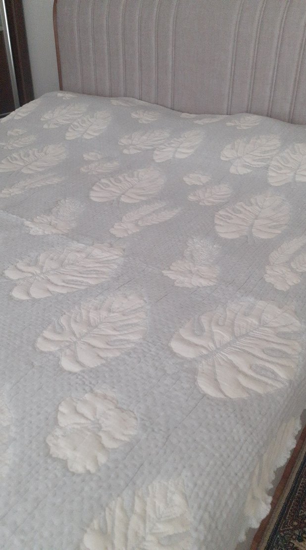 Gri beyaz renkte, nakışlı yaprak desenleriyle dokulu ve zarif bir yatak örtüsü. ️.