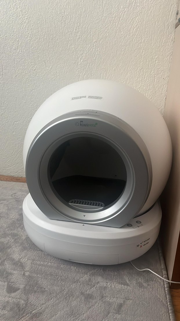 Beyaz ve gri renklerde, küresel tasarımlı otomatik kedi tuvaleti. Geniş giriş ve kontrol düğmeleri bulunan taban mevcuttur. Garantisi vardır 14bine aldım uygun fiyata veriyorum kedim korktuğu için mecburiyet likten veriyorum