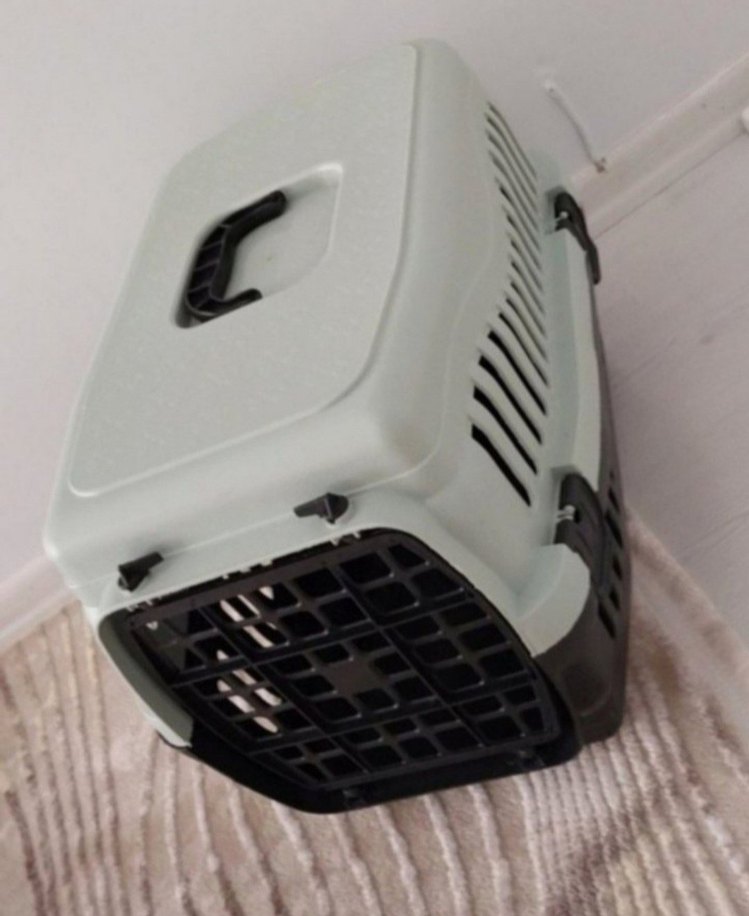 Gri ve beyaz plastik taşıma kabı, havalandırma delikleri ve ön kapı ile güvenli taşıma sağlar. Üstte taşıma sapı bulunur. boyu 47 eni 30 cm