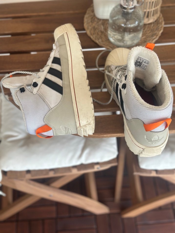 Gri, beyaz ve siyah çizgili, cırt cırt ve bağcıklı platform tabanlı kadın spor ayakkabısı. Spor ve sokak stiline uygun rahat tasarım. Tertemizdir