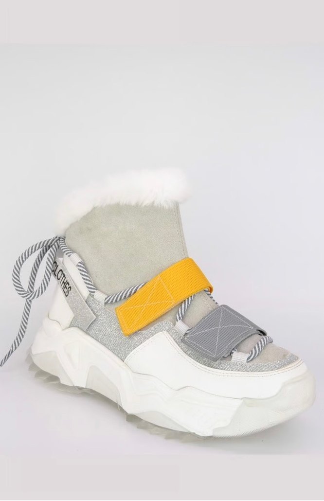 Gri beyaz renklerde, tüylü detaylı ve bağcıklı bağcık desenli, yumuşak kumaşlı, ayarlanabilir bantlı platform tabanlı sokak stili kadın spor ayakkabısı. ️