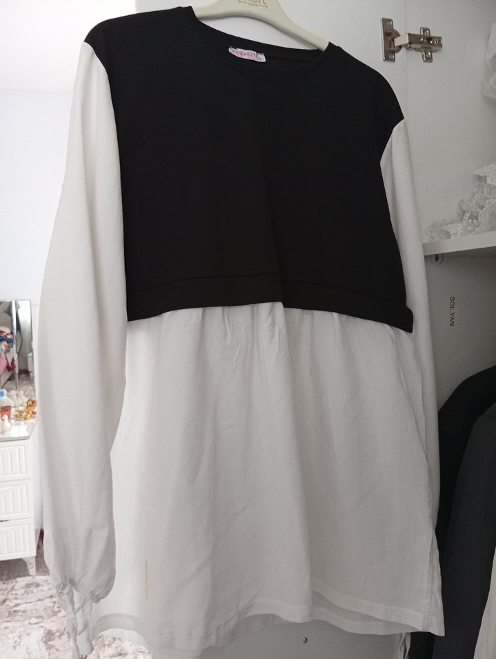 Gri ve beyaz renkte, salaş kesim, uzun kollu, yuvarlak yakalı hamile bluzu. Yumuşak sentetik kumaştan, gündelik sokak stiline uygun.