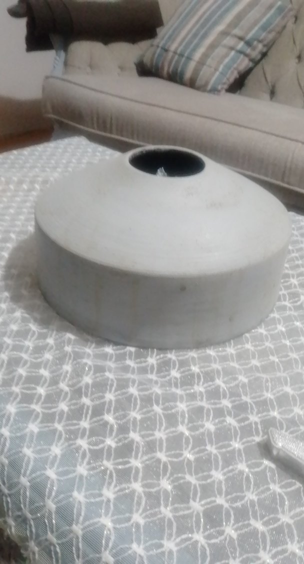 Gri ve beyaz tonlarda, geniş ve yassı şekilli seramik vazo.
