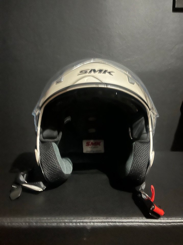 SMK markalı beyaz motosiklet kaskı, tokalı ve dayanıklı plastikten yapılmıştır. Desensiz yüzeyiyle grunge punk tarzına uygundur. Az kullanılmış bir çizik var fotolarda mevcut