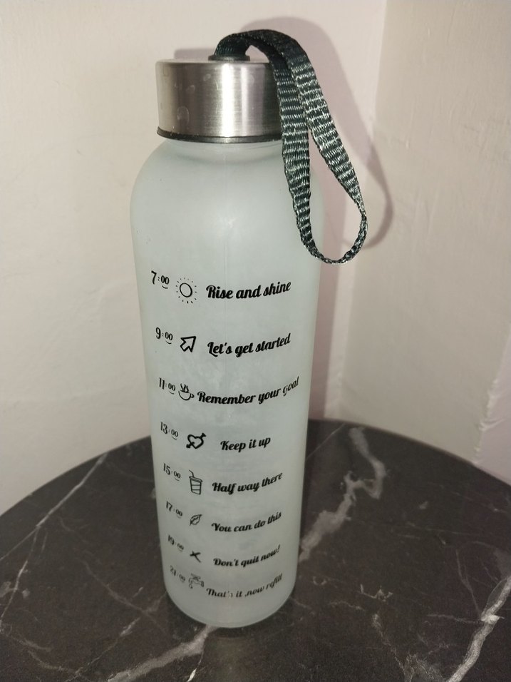 Gri beyaz renkli, saat işaretli ve taşıma kayışlı su şişesidir. Metal kapak ve şeffaf gövdeye sahiptir.