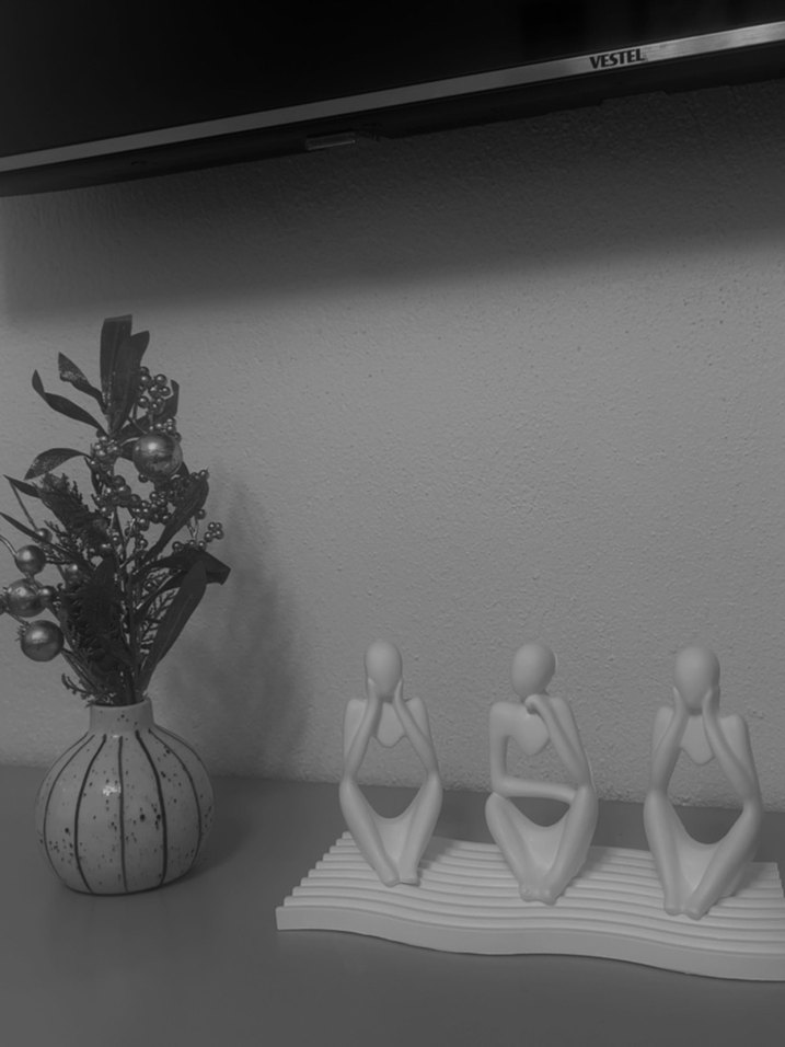 Gri ve beyaz renklerde, düşünceli pozlarda üçlü figür seti. Dalgalı taban üzerinde sade ve şık tasarım. ♂️