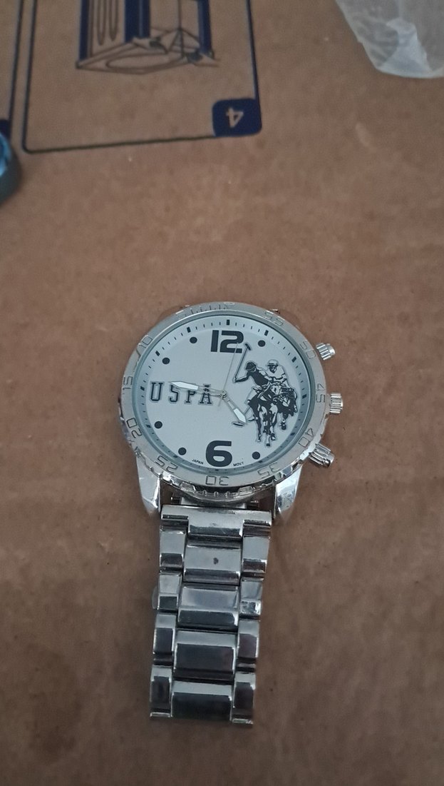 Gri ve beyaz renklerde, metal kayışlı ve kadranında USPA logosu bulunan erkek kol saati. ⌚