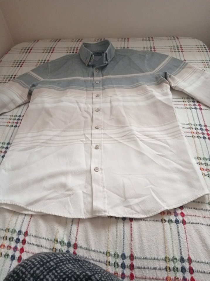 Bu erkek gömleği düğmeli ön, uzun kollu ve yakalıdır. Regular fit kesim, gri-beyaz geçişli tasarım ve pamuklu yumuşak kumaştan üretilmiştir. Günlük sokak stili için uygundur.