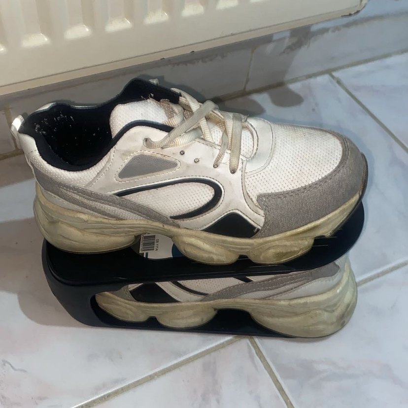 Beyaz ve gri tonlarda, yılan desenli platform topuklu kadın spor ayakkabısıdır. Bağcıklı ve kauçuk tabanlı, sokak modasına uygun bir tasarıma sahiptir.