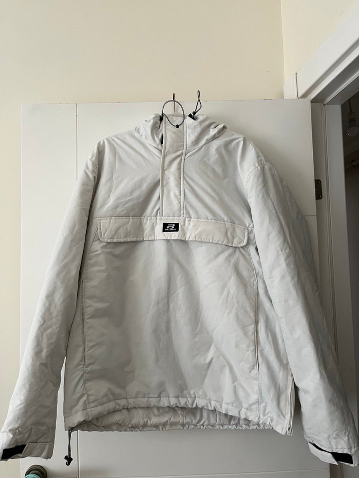 Gri beyaz renkli, yüksek yakalı ve fermuarlı, bol kesim kadın ceketi. Yumuşak ve sıcak kumaştan, midi boyda, uzun kollu, desen içermeyen dış mekan kullanımı için uygun.