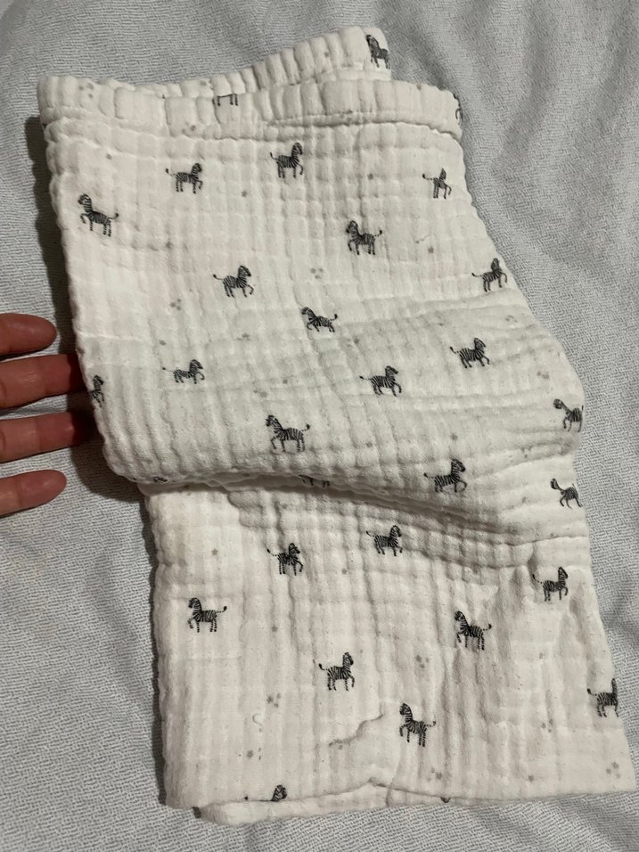 Gri zebralı desenleriyle beyaz keten kumaştan yapılmış, yumuşak ve nefes alabilen çocuk battaniyesi.