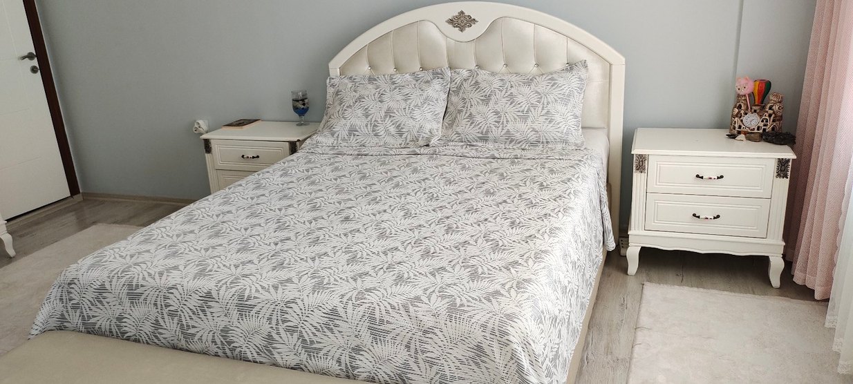 Gri ve beyaz tonlarda zebra desenli yatak örtüsü, yatak odasına zarif bir hayvan deseni dokunuşu katar. ️