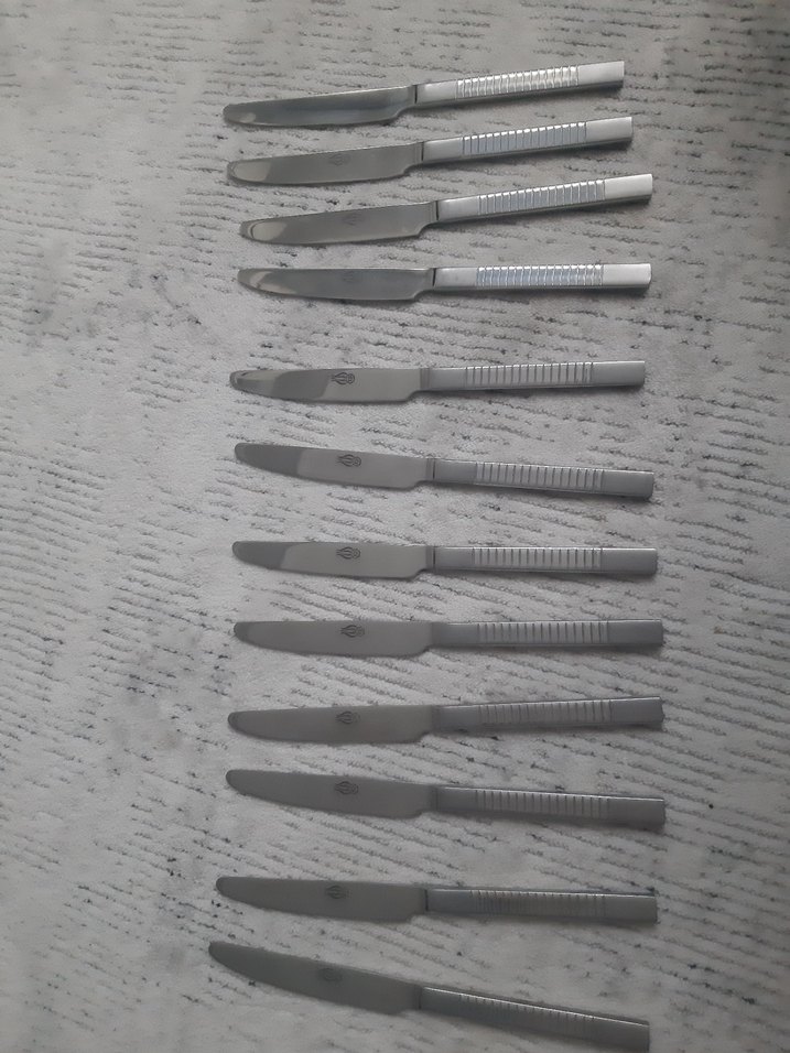 Gri renkli, çizgili saplara sahip 12 parça bıçak seti. Saplar kavramayı artırmak için dokuludur.1 parca yemek çatalı ağır üründür hafif değildir kullanıma bağlı kılcal çizik ler mevcuttur