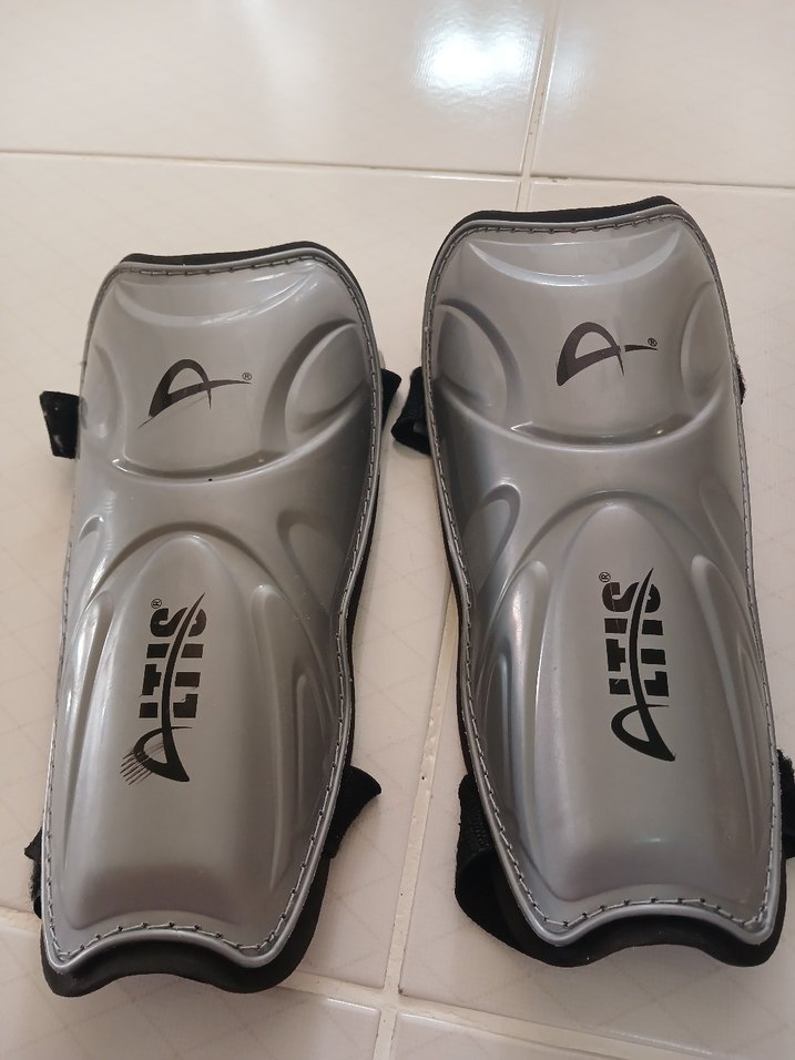 Gri renkli, baskılı plastik malzemeden yapılmış biker diz koruyucuları, ayarlanabilir Velcro bantlarla sabitlenir.