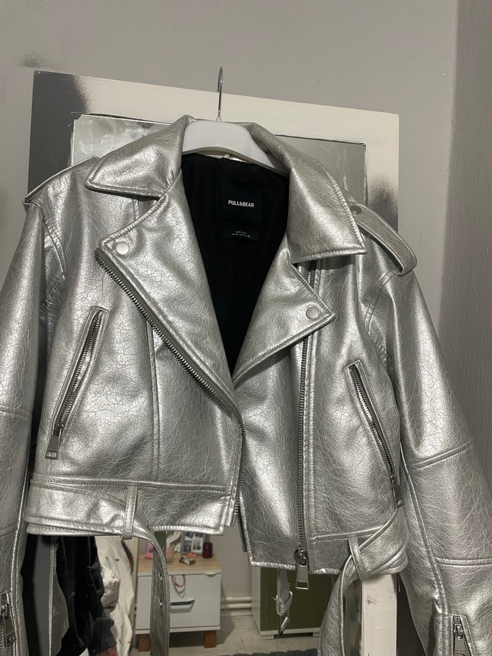 Bu dar kesim gri deri biker ceket, yakasında kesik detay ve tokalı aksesuarlar bulunur. Kısa boy ve askılı kolludur, şık bir görünüm sağlar.