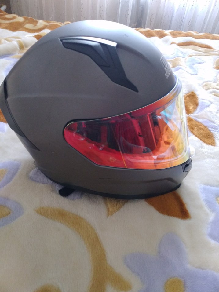 Tokalı, gri renkli plastik malzemeden yapılmış, kırmızı tonlu şeffaf vizöre sahip sokak stili biker kask. Desensiz, şık tasarım.