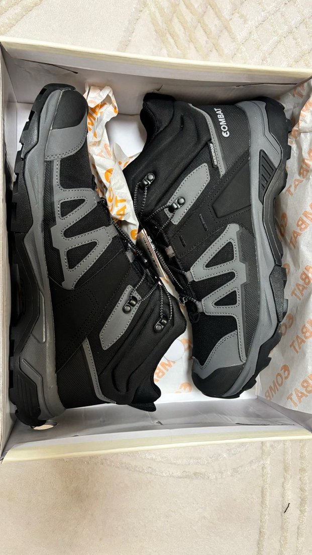 Gri renkli, baskılı desenli erkek biker tarzı outdoor ayakkabılar, kauçuk tabanlı ve bağcıklı yapısıyla trend görünüme uygundur. Sıfır