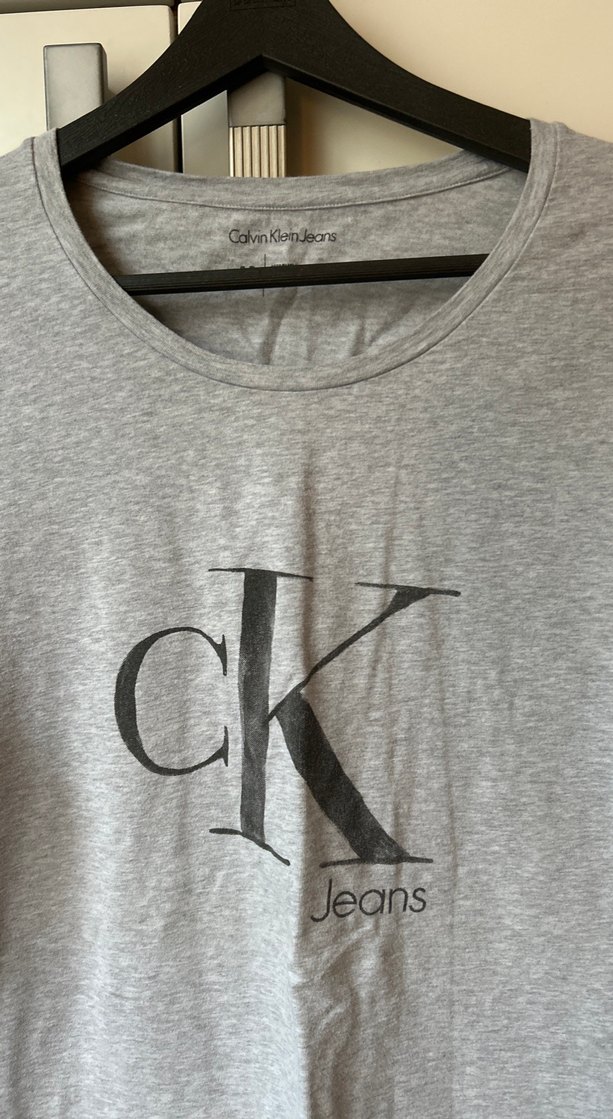 Gri renkte, keten kumaştan, baskılı 'ck Jeans' yazılı, bisiklet yaka ve rahat kesime sahip erkek tişört. Günlük kullanıma uygun, salaş ve şık görünümlü.