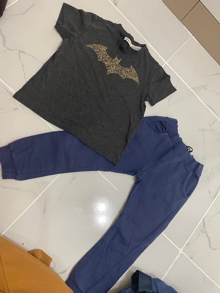 Gri bisiklet yaka tişört üzerinde yarasa baskısı ve mavi bol kesim jogger eşofman, rahat bir sokak stili sunar. Eşofman ayarlanabilir bel bantlıdır.