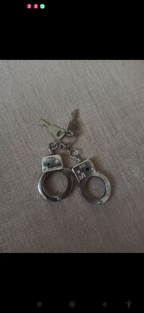 Gri renkte, metal kelepçe figürlü ve zincirle bağlı anahtarlık, küçük anahtar detayıyla grunge punk tarzını yansıtıyor.