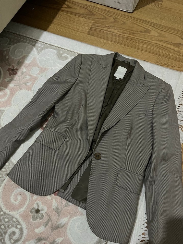 Gri renkte, düğmeli, normal boyda kadın blazer. Uzun kollu, dik yaka ve düz dokulu, ofis ve günlük kullanıma uygun.