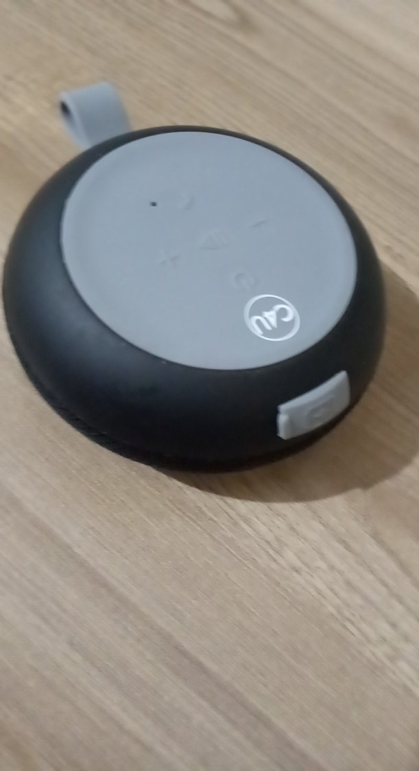Gri renkli Bluetooth hoparlör, üstte kullanımı kolay kontrollerle kablosuz ses oynatımı sağlar. Kompakt tasarımıyla taşınabilir.