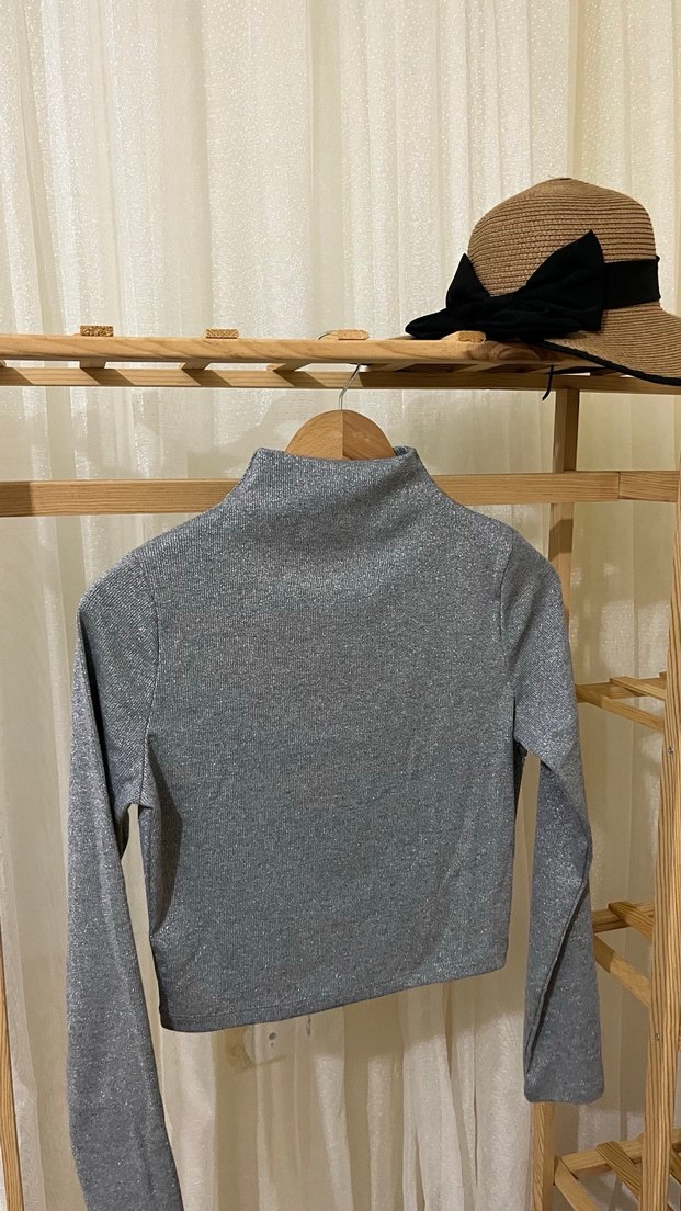 Gri renkte, boğazlı ve uzun kollu, kısa kesim bluz