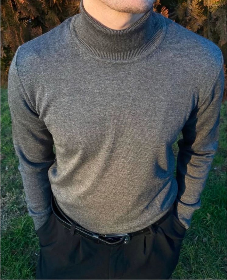 Gri renkli, yün örme kumaştan boğazlı ve uzun kollu erkek kazak. Regular fit kesim, desensiz tasarım, günlük ve sokak stiline uygun.