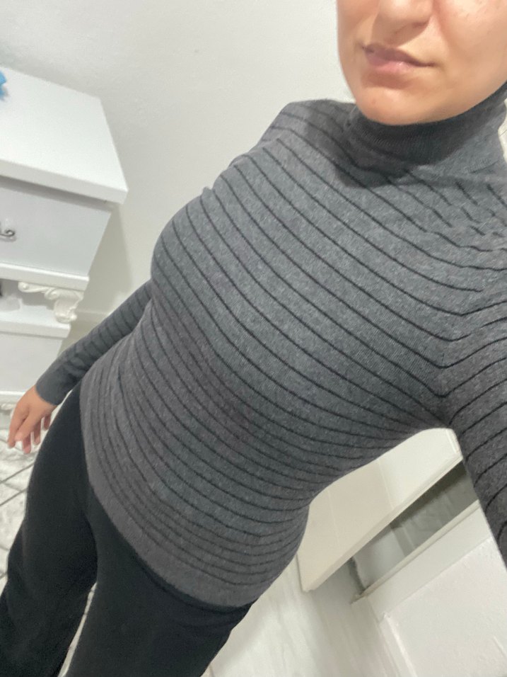 Gri boğazlı ve uzun kollu, ince örgü yapıda, yün kumaştan yapılmış, normal boy ve vücuda oturan kadın kazak. Günlük kullanıma uygun, sade ve rahat. Sa beden ama likralı çok esnek l beden bile giyebilir
