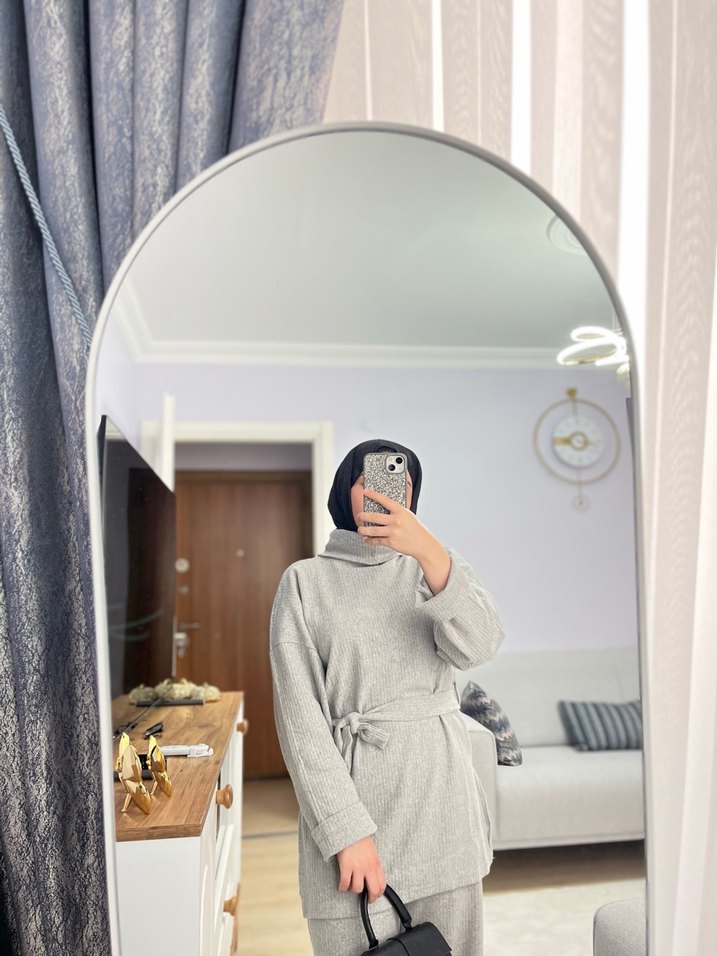Yumuşak ve sıcak kumaştan, boğazlı ve belden bağlamalı, gri kadın takımı. Rahat kesimiyle günlük kullanıma uygundur. S/M