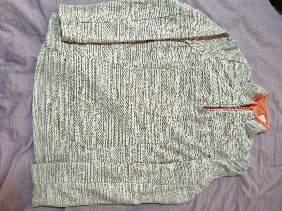 Gri renkli, boğazlı ve uzun kollu, vücuda oturan kadın kazak. Rahat ve modern bir günlük kullanım ürünü. Polar, decatlon marka M beden omuzldan uca 60 cm iki koltuk altı arası 44 cm