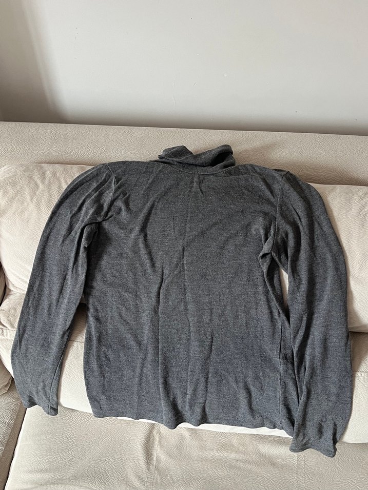 M/L bedene olur. Gri renkte, balıkçı/boğazlı yaka ve uzun kollu, yumuşak, normal boyda kadın triko.