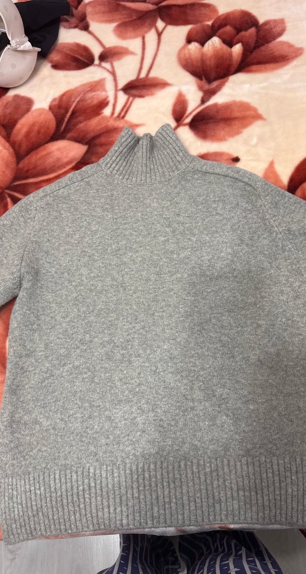 Boğazlı, uzun kollu, örgü dokulu gri kadın yün kazak. Rahat kesimli ve normal boyda, günlük kullanıma uygun sıcak bir parça.