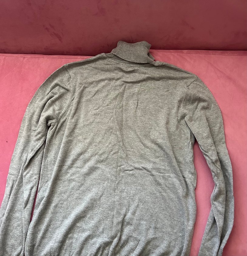 uzun kollu, gri renkli, yumuşak kumaştan yapılmış, normal boyda, dar kesim kazak.
