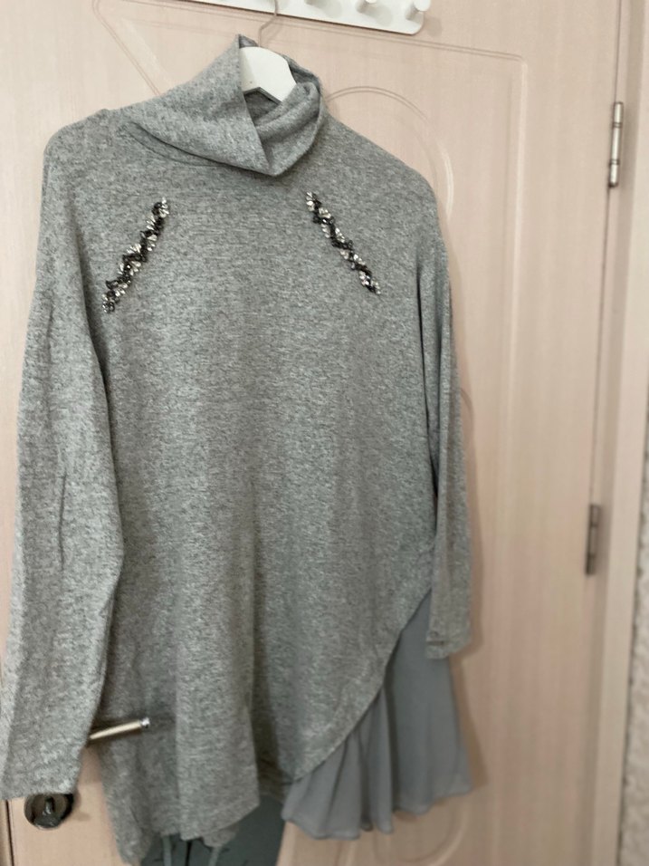 Gri renkte, boğazlı ve uzun kollu, bol kesim triko. Nakış detaylı ve uzun boylu, rahat günlük kullanım için idealdir.