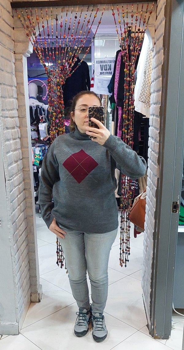 Gri örgü yünden, boğazlı ve salaş kesim kadın kazak. Önünde bordo baklava deseni bulunur, gündelik kullanıma uygundur. Standart beden 36-44 bedene uyumlu