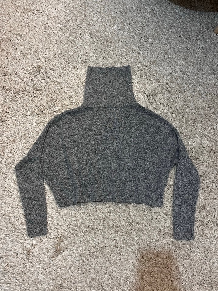 Gri renkli, örgü yün kumaştan yapılmış, boğazlı ve uzun kollu, rahat kesim midi uzunlukta kadın kazak.