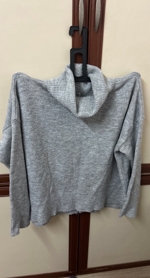 Gri boğazlı, uzun kollu, örgü dokulu, rahat kesim kadın kazak. Normal midi uzunluğunda, desen içermeyen, günlük sokak stiline uygun rahat bir parça.