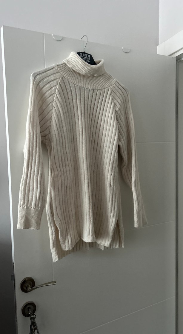 Kadınlar için örgü boğazlı, uzun kollu, bol kesim ve diz hizasında gri renk kazak. Rahat ve desensiz, günlük sokak stili için uygun.