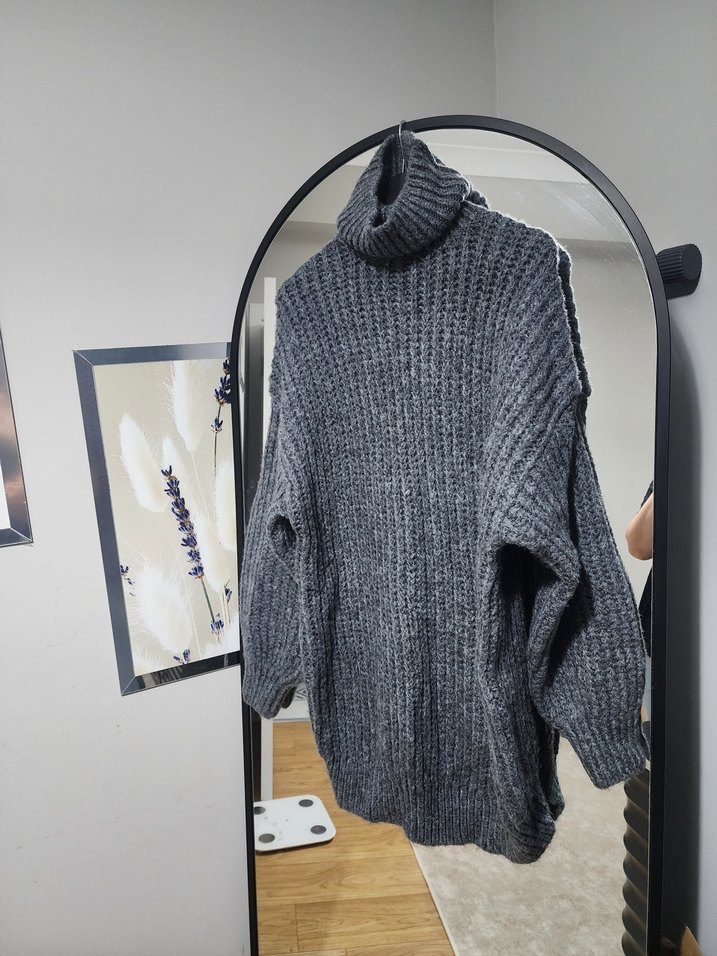 Gri renkli, boğazlı ve uzun kollu örgü kazak, bol kesimiyle rahat ve gündelik kullanıma uygun bir tasarıma sahiptir.
