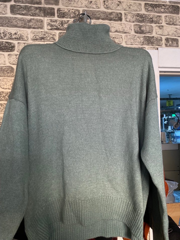 Gri boğazlı örgü kadın kazak, yumuşak yün kumaştan, uzun kollu ve bol kesimdir. Günlük kullanıma uygun, rahat midi boyda bir modeldir. Overize modeldir.